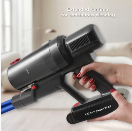 The 29.6V lithium-ion battery with a capacity of 2000mAh offers powerful performance and ensures up to 60 minutes of intensive cleaning using the motorized nozzle. The battery is detachable and can be charged separately from the device for greater convenience.