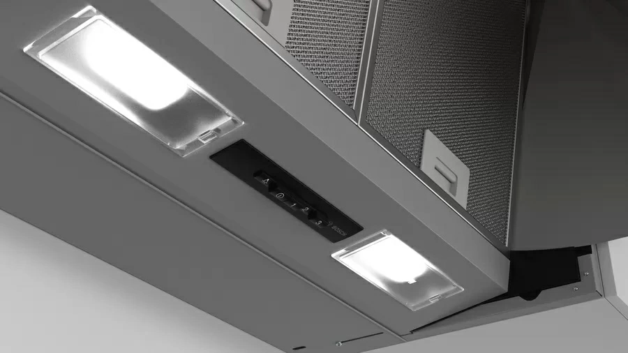 Ο απορροφητήρας της εταιρίας Bosch διαθέτει πρόσοψη που επεκτείνεται προς τα έξω και μπορεί να δεχτεί ένα πάνελ ξύλου που ταιριάζει με το ξύλο της κουζίνας.
