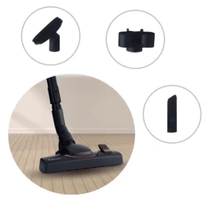 Includes a handle for increased comfort during use, a telescopic tube for a wider cleaning range, 2 handles for easy transport, and 2 storage options (vertical and horizontal).