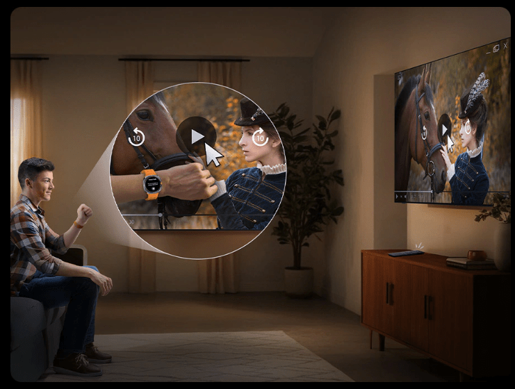 Easily manage your TV with your compatible smartwatch. Wear your compatible Galaxy Watch and use gestures, such as pinching to make a selection or shaking your wrist back and forth to pause and play.