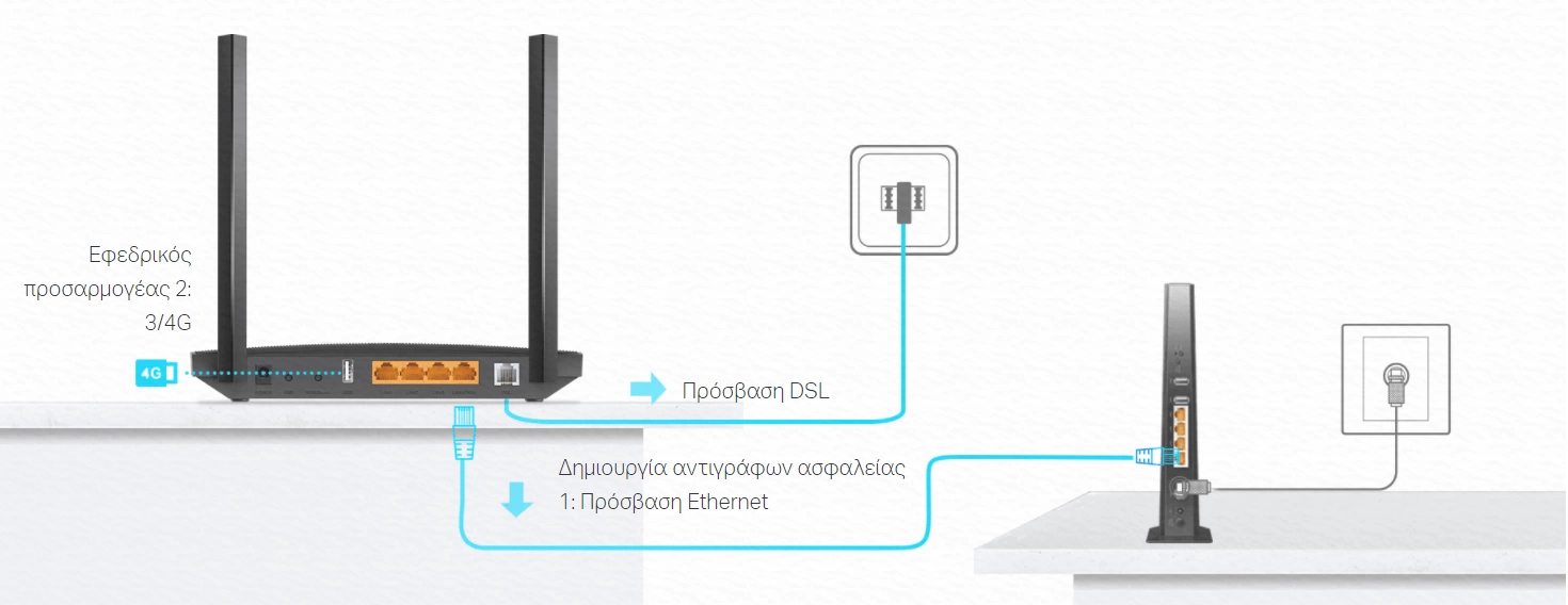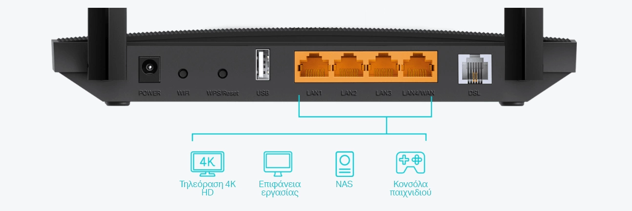 Με διάφορες θύρες, το Archer VR400 σας προσφέρει μια σειρά από επιλογές για σύνδεση στο Διαδίκτυο. Ως εφεδρική επιλογή, η θύρα LAN / WAN επιτρέπει στο Archer VR400 να δέχεται συνδέσεις από καλώδια και μόντεμ ινών μέσω καλωδίου Ethernet. Επιπλέον, η θύρα USB υποστηρίζει συνδέσεις dongle 3G / 4G.