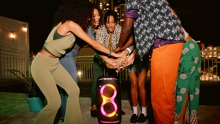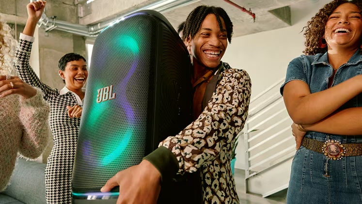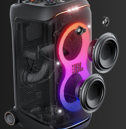 With the JBL PartyBox Stage 320, you can start the celebration anytime, anywhere. Transform any space, indoors or outdoors, into a dance floor. Powerful JBL Pro Sound and deep bass motivate the crowds to dance and impress with a light show that adapts and syncs with the rhythm of the music. Use the microphone and guitar ports to stand out on stage, or create your own party rhythm with the speaker's interactive effects. The sturdy handle and wheels of the speaker allow you to take the JBL PartyBox Stage 320 wherever you want, and once you arrive, its waterproof design means a little rain won't stop the party. The best part? Up to 18 hours of battery life, and if the party continues, simply replace the battery for endless fun. For an even bigger party, it's easy to connect the speaker with other speakers that feature JBL Auracast, either wirelessly or using the JBL PartyBox app. Bring your friends along and elevate every experience with the JBL PartyBox Stage 320.