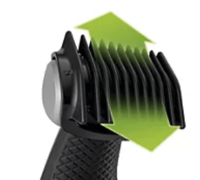 Το σύστημα ξυρίσματος περιλαμβάνει 3 ρυθμιζόμενες χτένες για τριμάρισμα στα 2 χιλ., 3 χιλ. και 5 χιλ. ή για χρήση χωρίς χτένα για πιο βαθύ ξύρισμα.