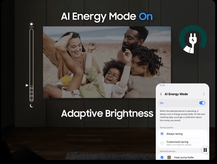 Παρακολουθήστε τη χρήση ρεύματος της συσκευής σας, ενεργοποιώντας το AI Energy Mode. Η τηλεόραση προσαρμόζει αυτόματα τη φωτεινότητα σύμφωνα με τον φωτισμό του χώρου και τη δραστηριότητα του χρήστη. Επίσης, ρυθμίζει απαλά τη φωτεινότητα σε διάφορες σκηνές.