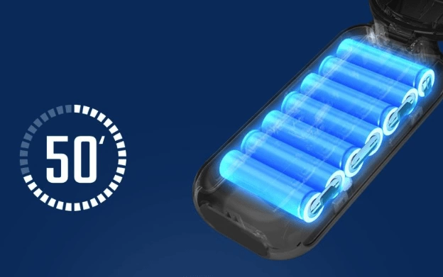 The rechargeable 25.9V lithium-ion battery with a capacity of 2200mAh offers exceptional power and ensures up to 50 minutes of deep cleaning using the motorized brush. The battery is removable and can be charged separately from the device for greater convenience.